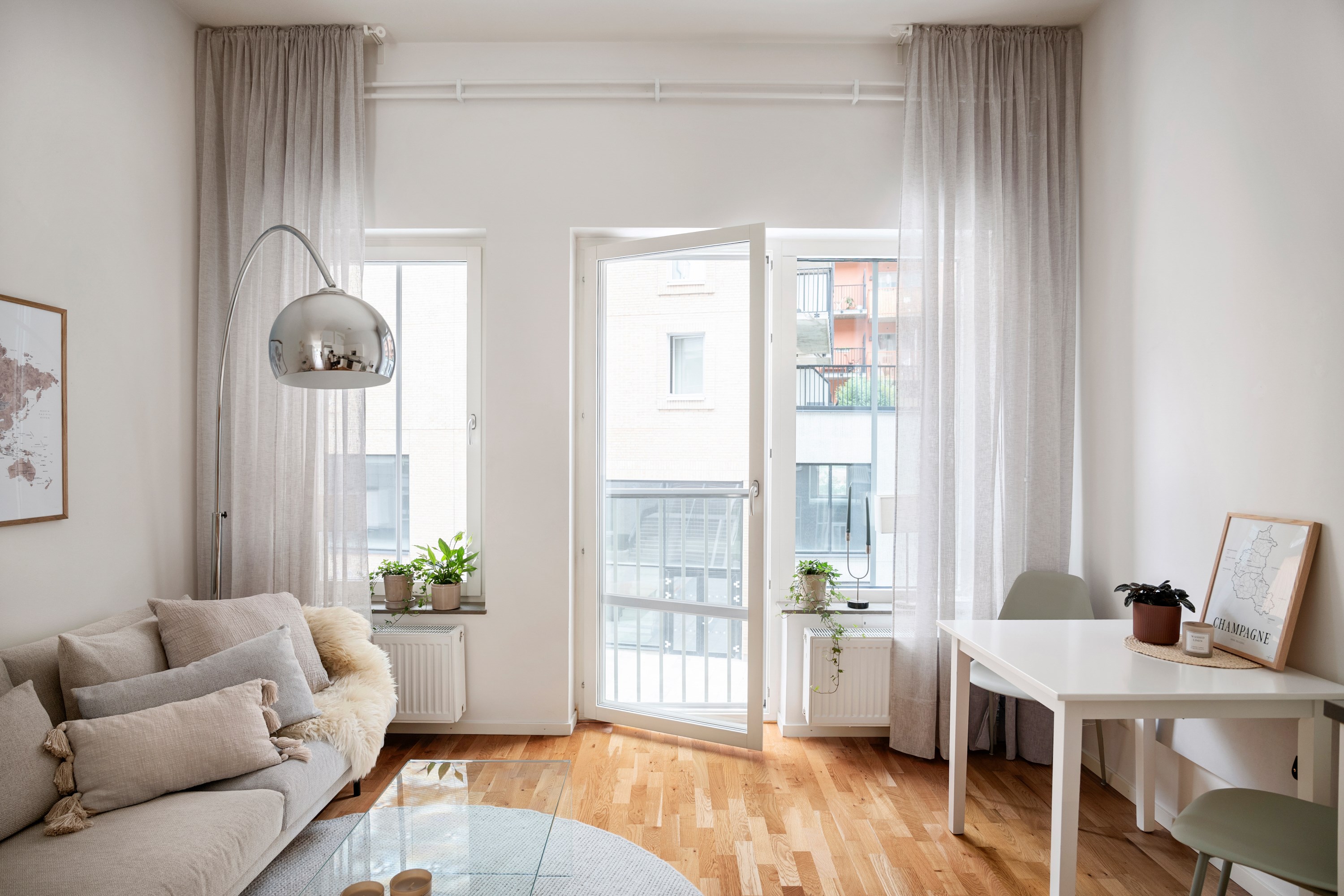 Trivsamt vardagsrum med fransk balkong i öppen planlösning med köket. Här finns god plats för soffa och matplats.