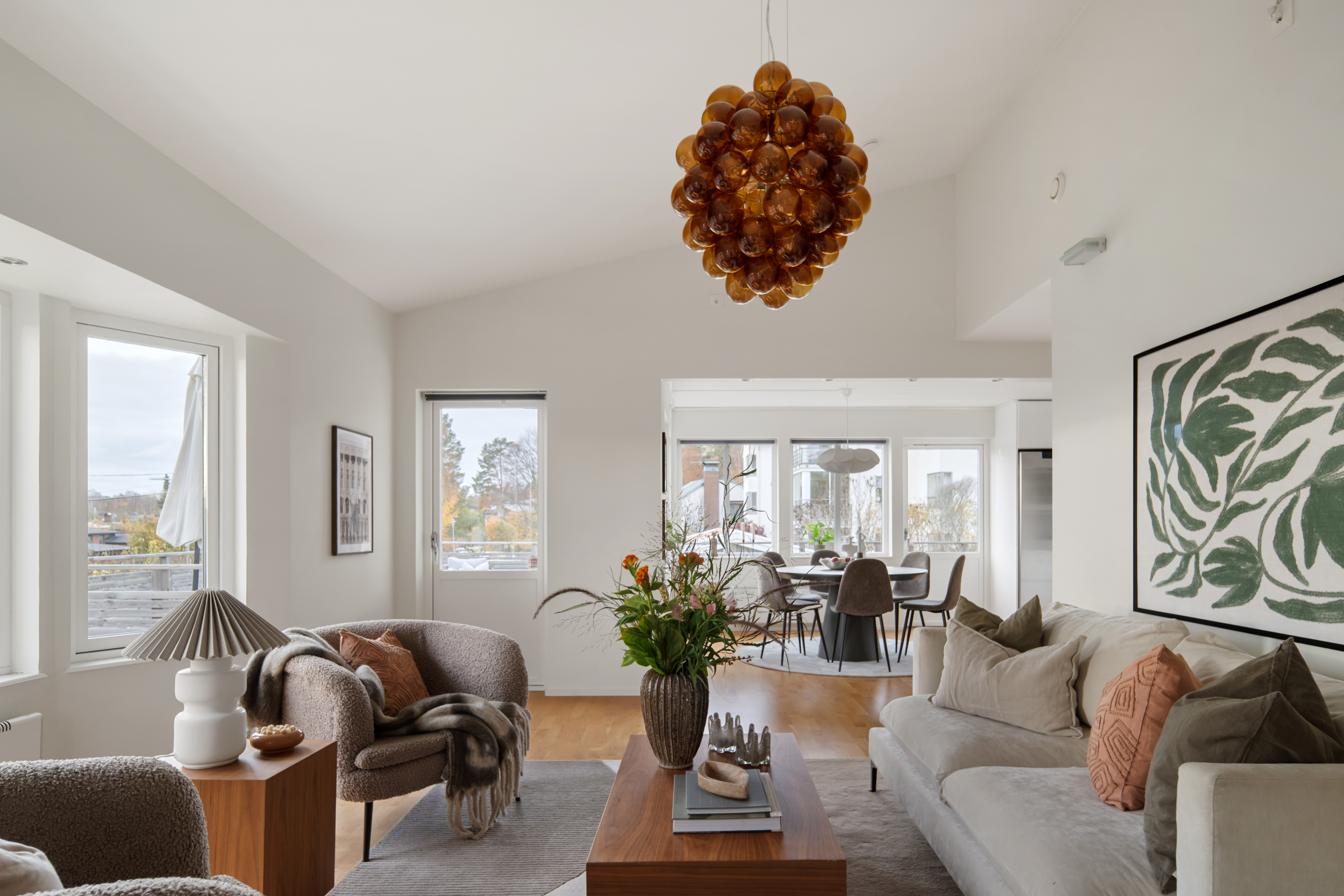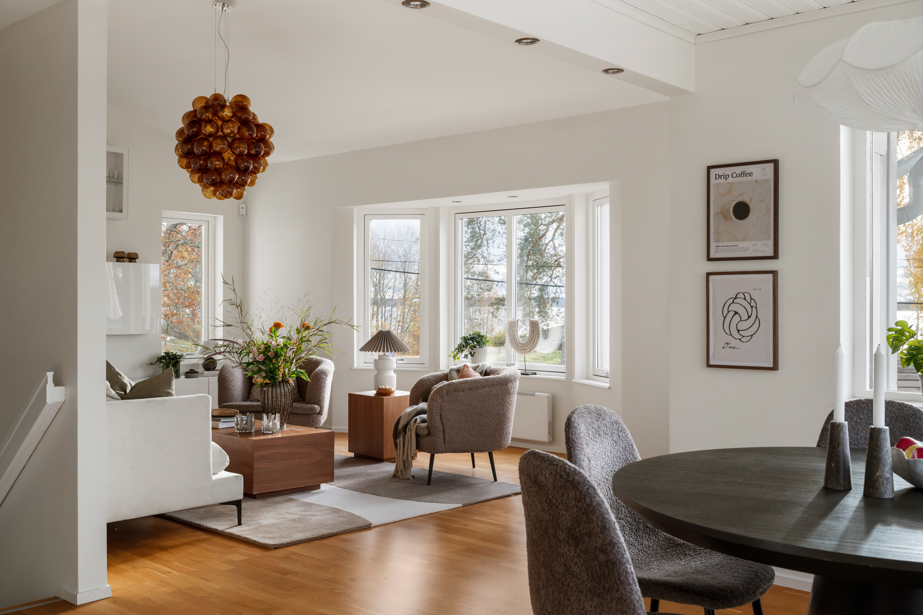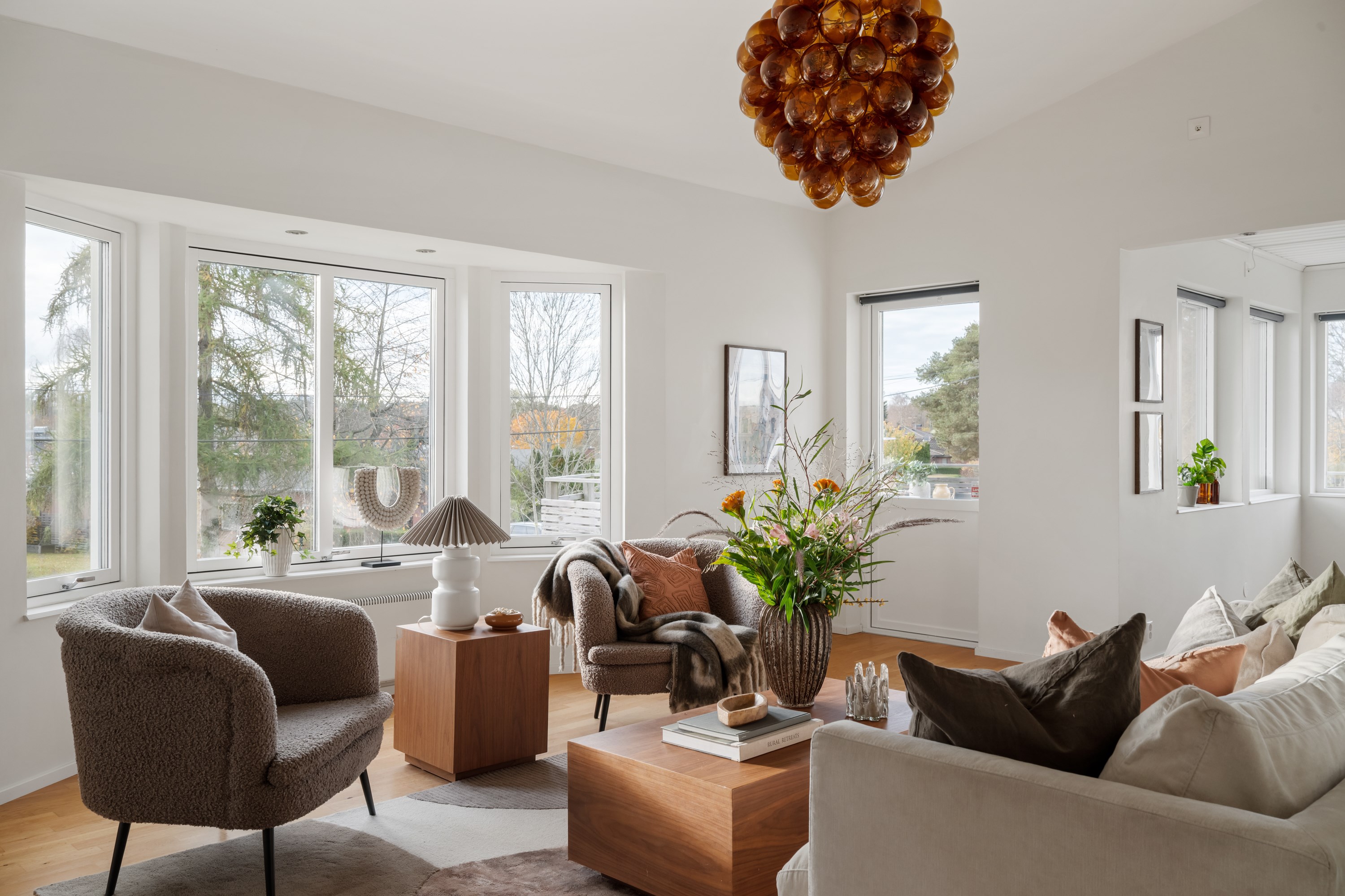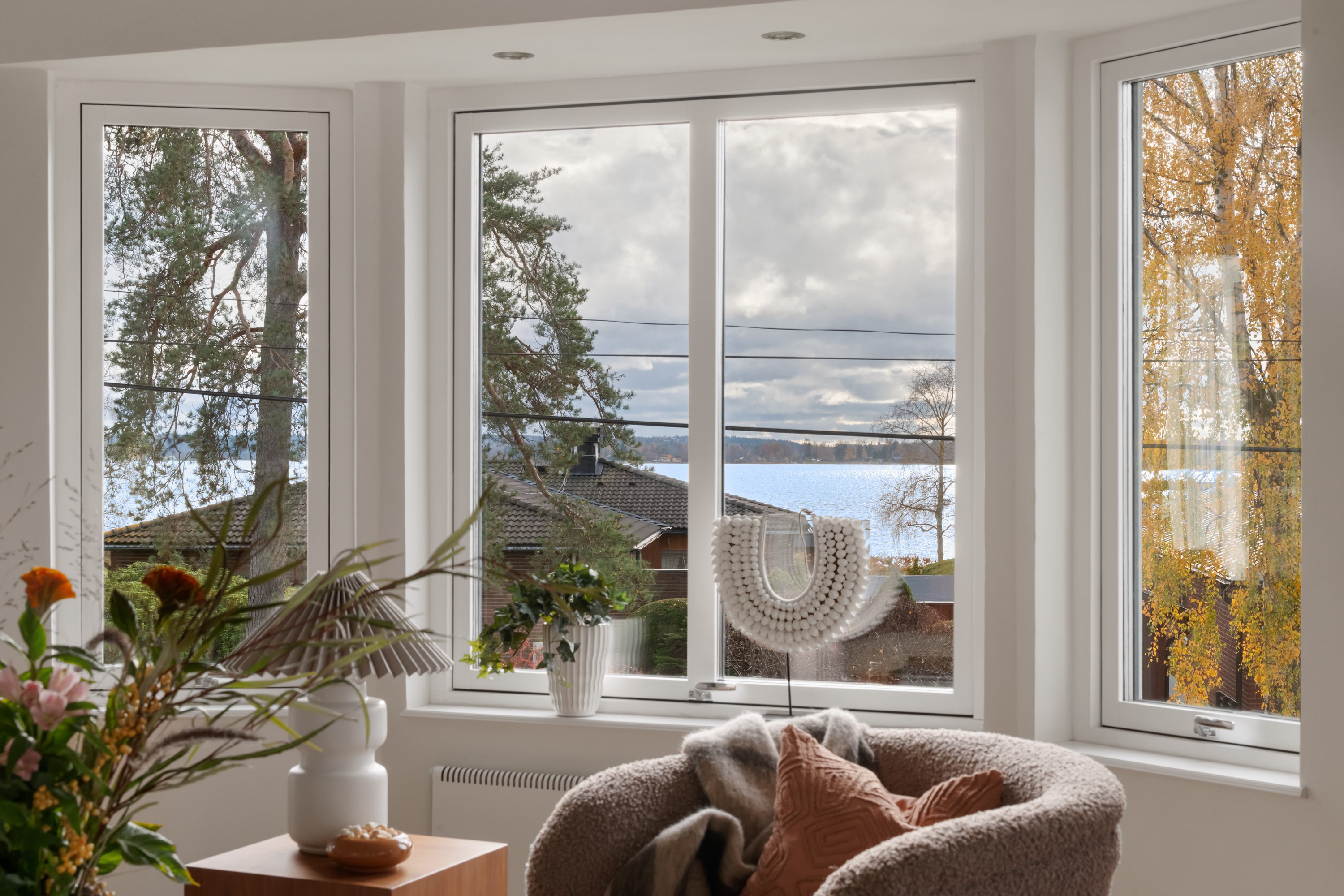 Trivsamt vardagsrum med burspråk och havsutsikt, en takhöjd om 3,5 meter och fönster i tre väderstreck samt utgång till terrassen.