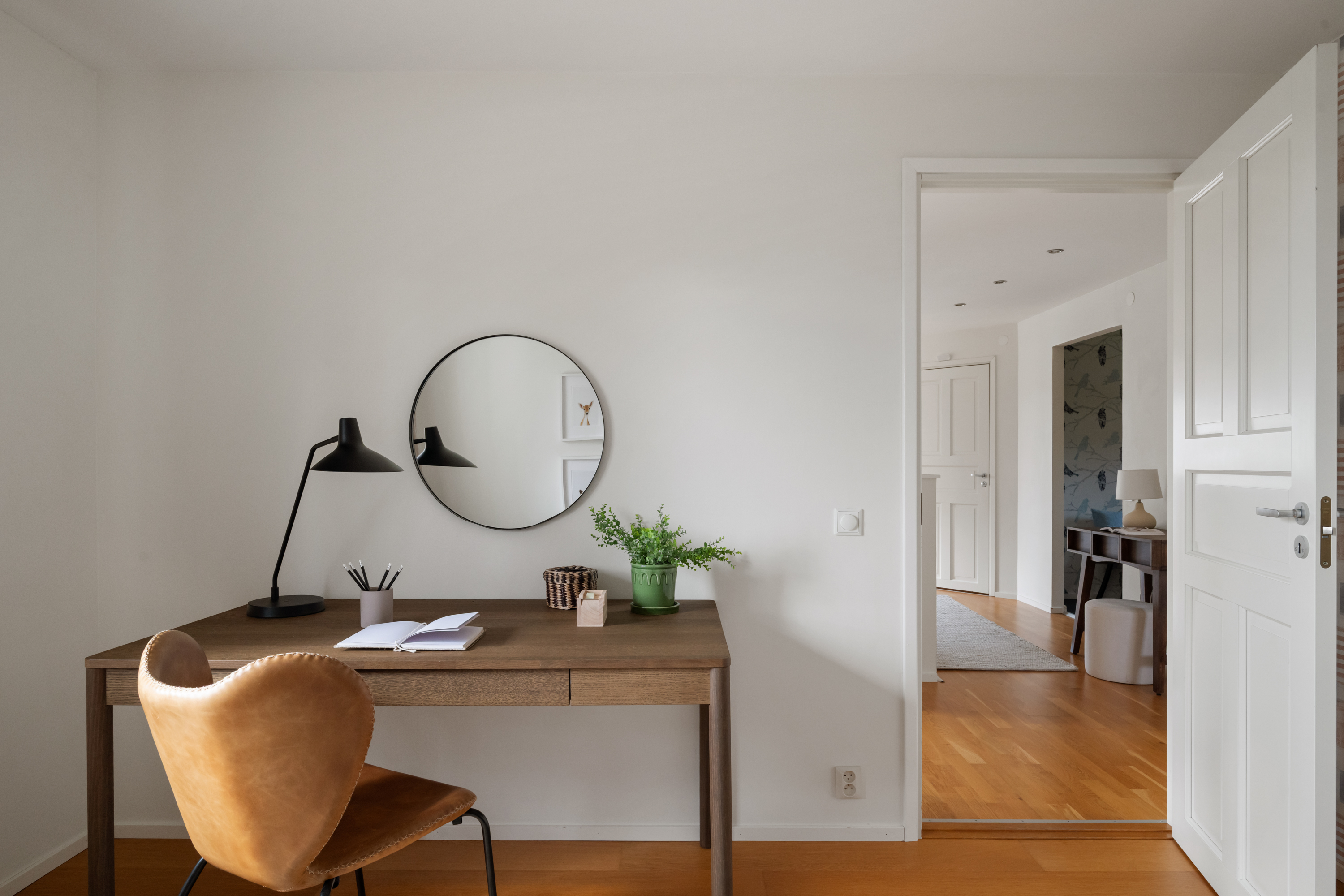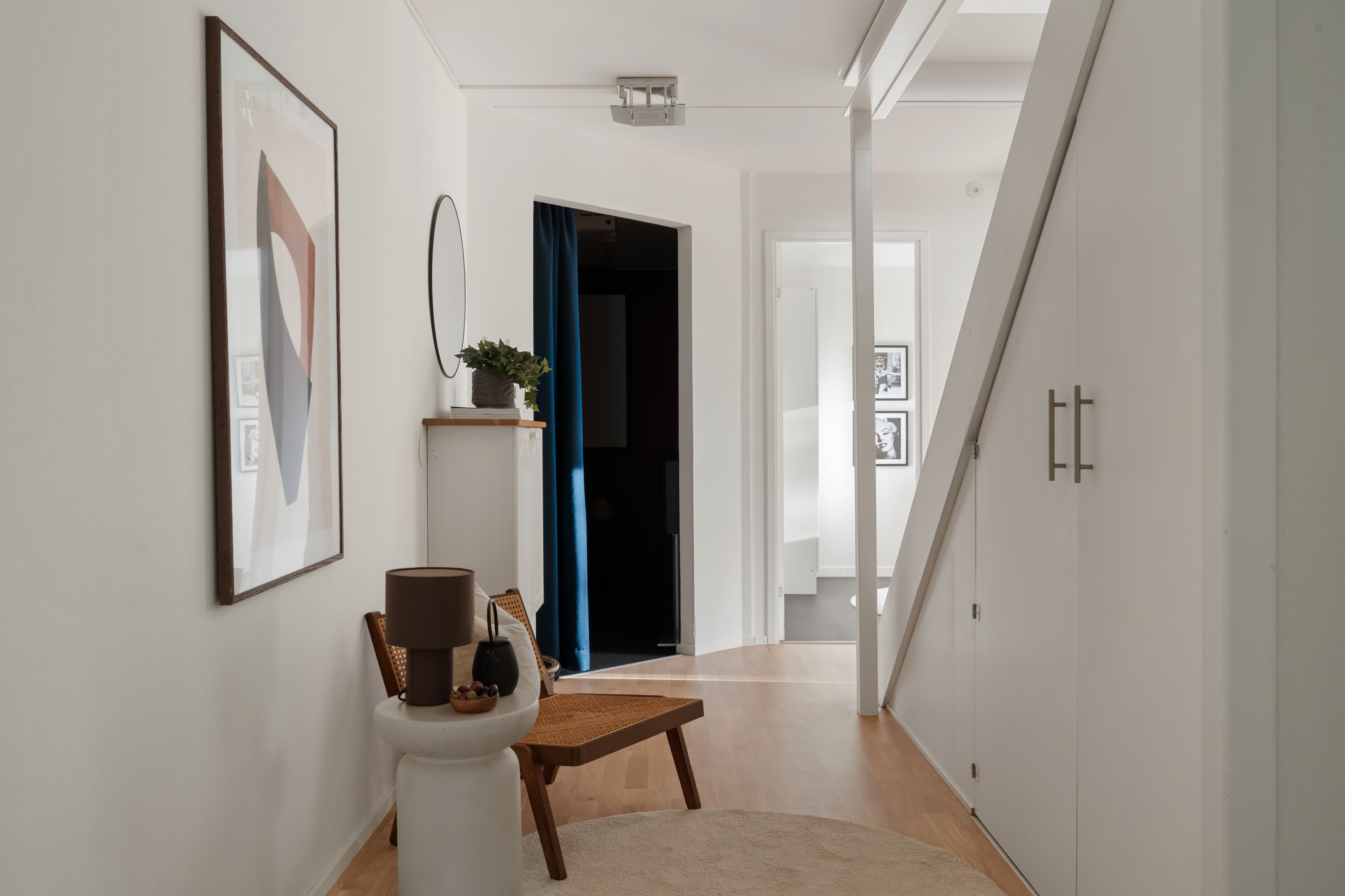 Den nedre hallen har goda förvaringsmöjligheter under trappen där det idag står en vinkyl och en byrå.