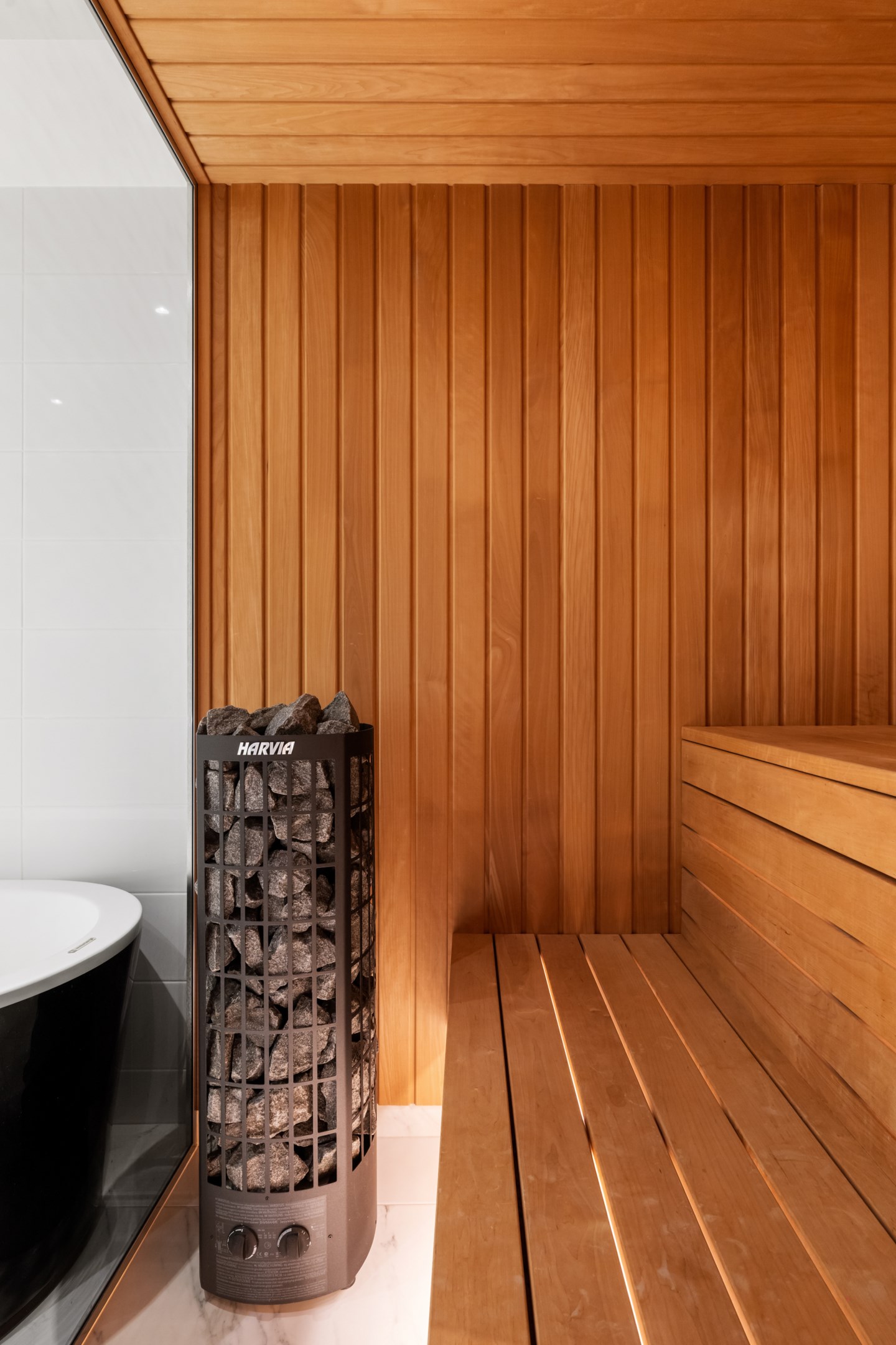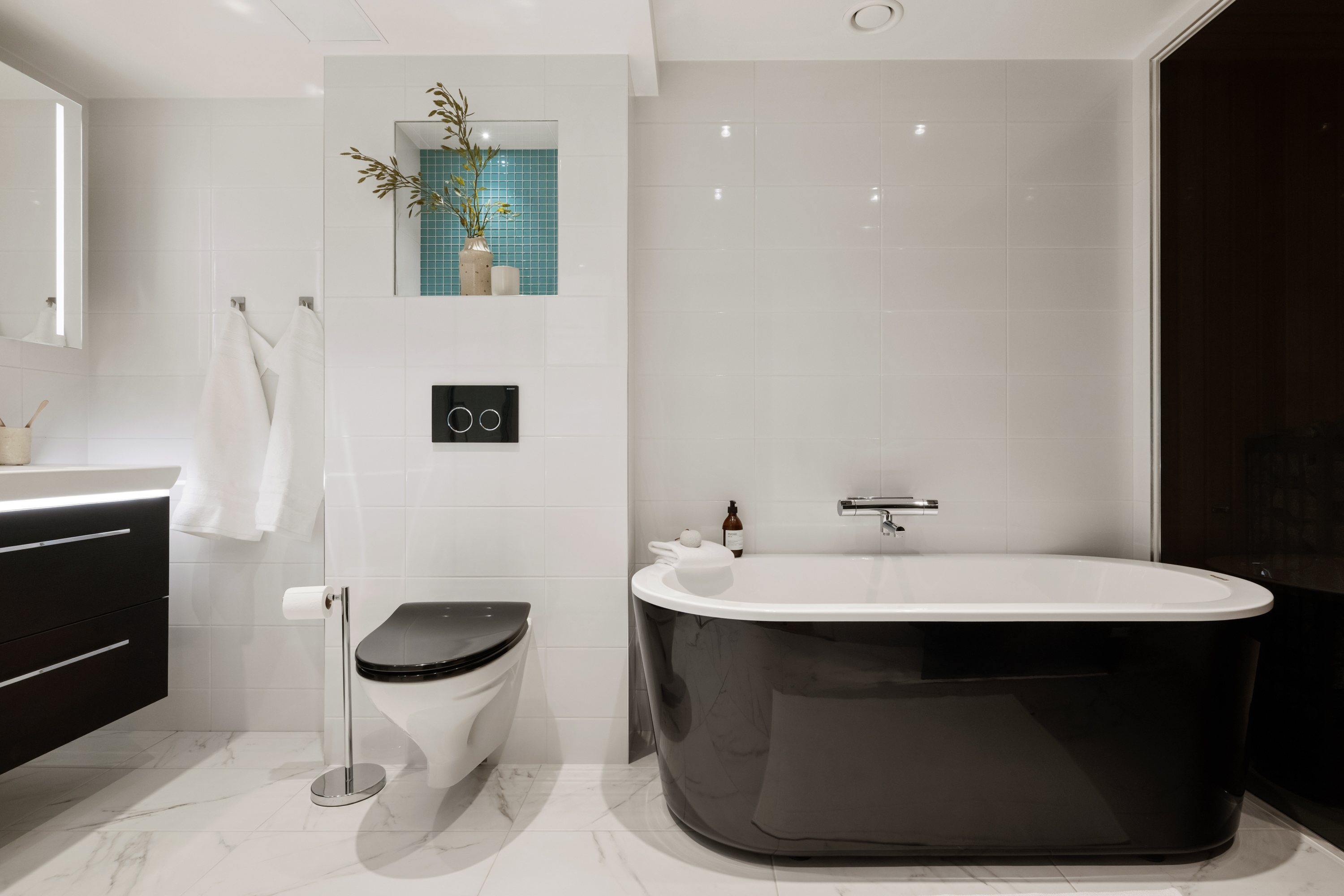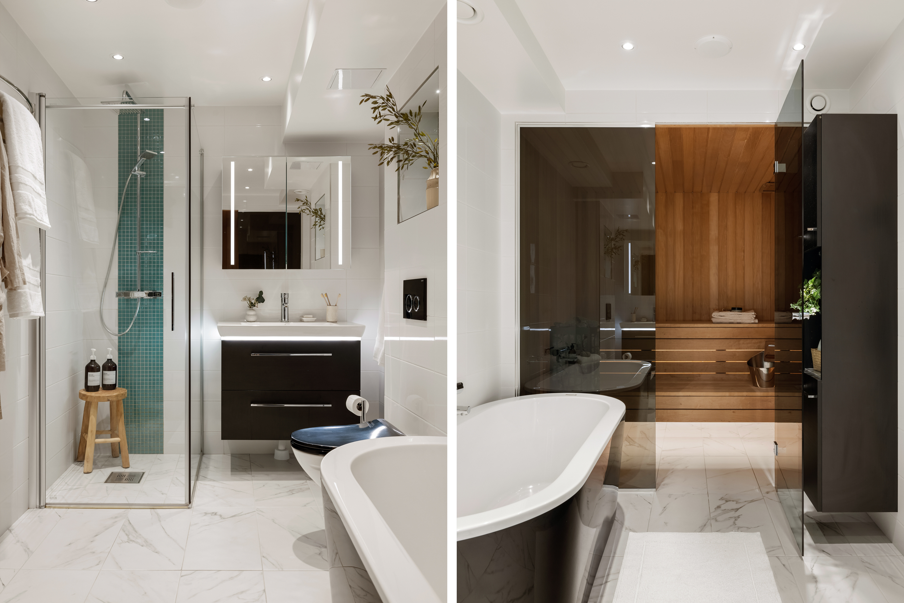 Badrum med golvvärme, bastu samt både dusch och badkar. Här finns ett stort tvättställ med kommod och spegelskåp, vägghängd wc samt handdukstork och ytterligare förvaringsskåp.