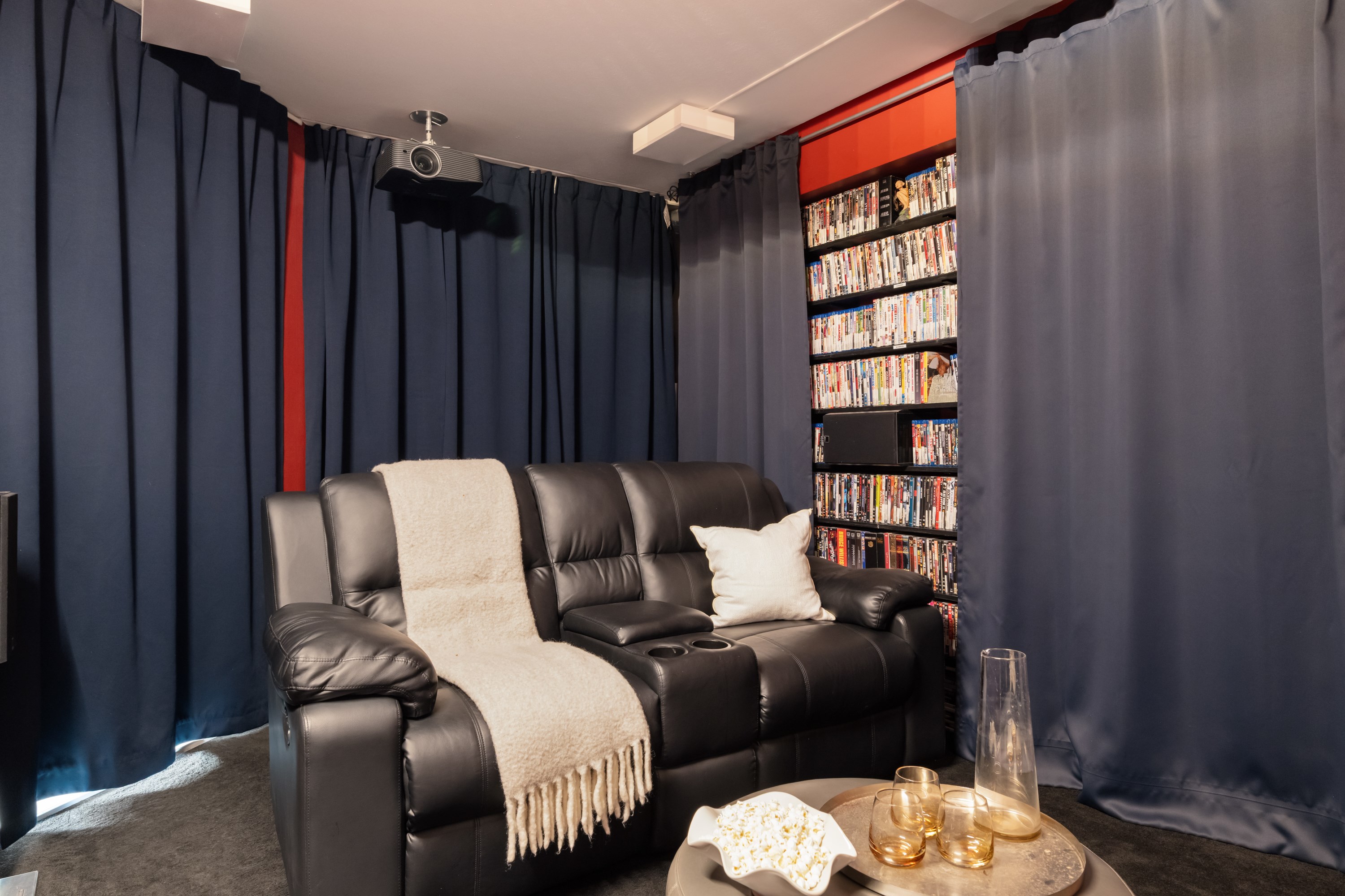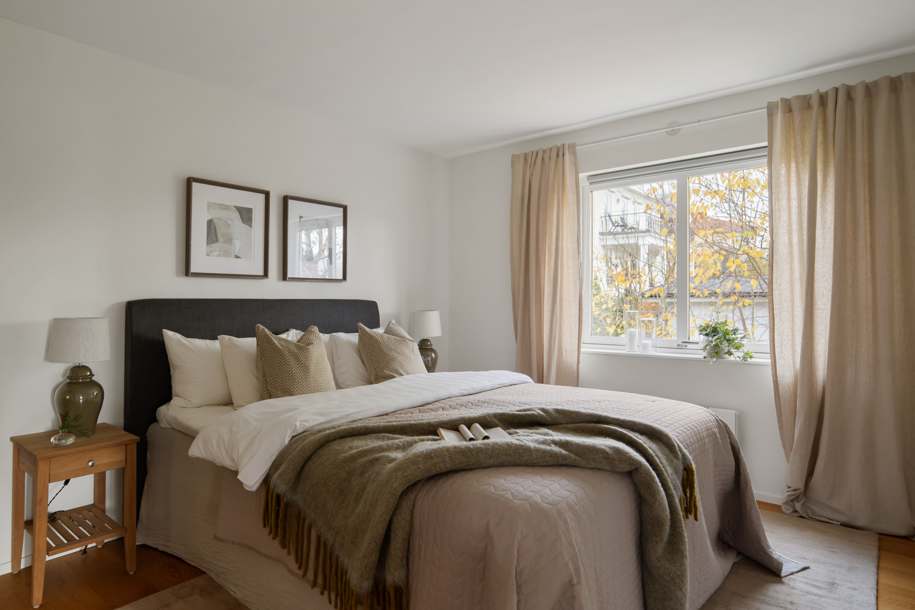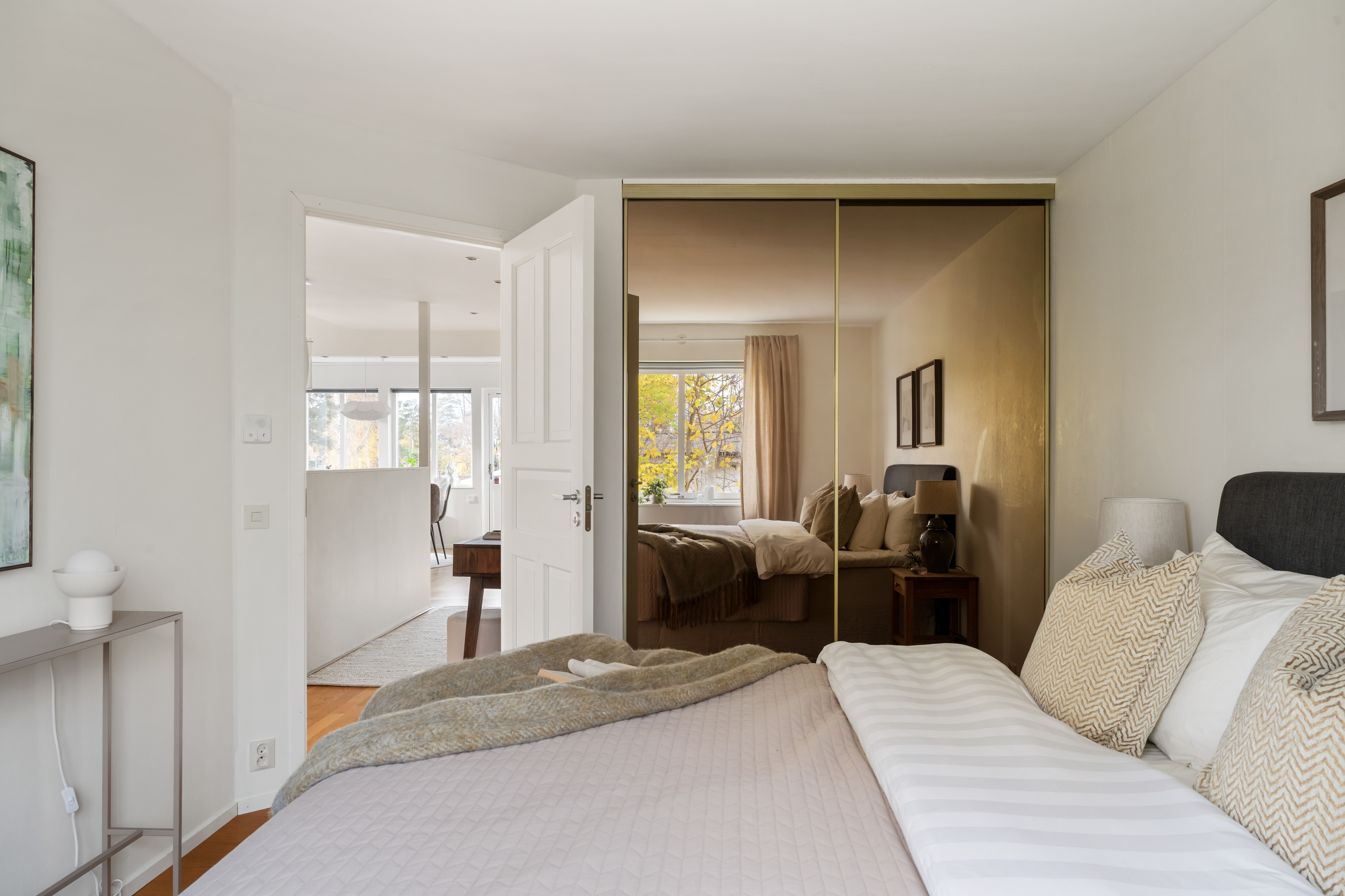 Det primära sovrummet rymmer en stor dubbelsäng med tillhörande möblemang samt har en inbyggd garderob bakom skjutdörrar.