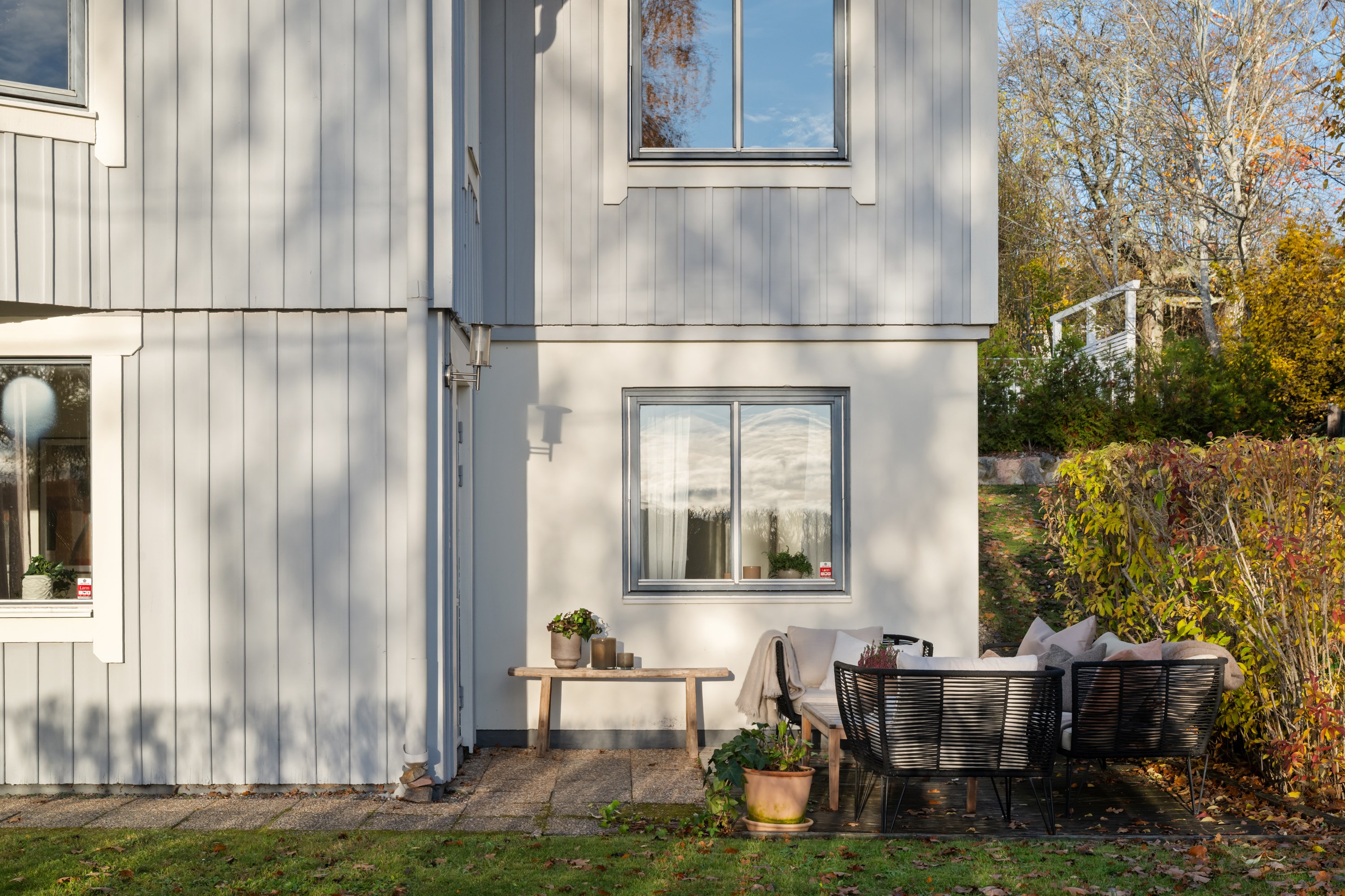 Vardagsrummet på nedre plan har fönster i tre väderstreck och utgång till trädgården via uteplats. Detta rum går att dela av i två rum och kan öppnas mot altanen samt den nedre hallen.