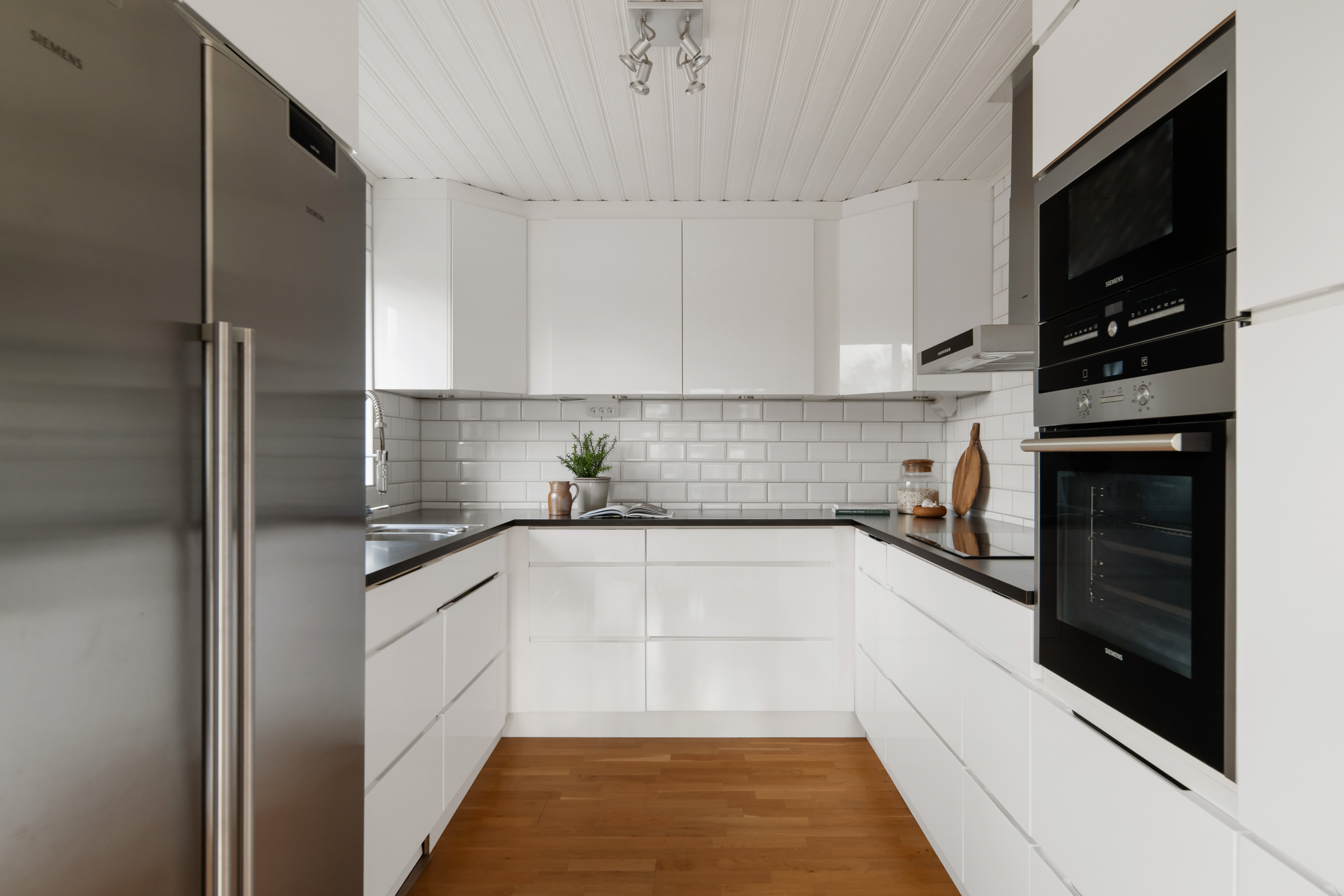 Stilrent kök goda arbetsytor och gott om förvaringsmöjligheter samt fönster i västerläge. Den maskinella utrustningen är från Siemens och består av rostfria, side-by-side, kyl och frys, integrerad diskmaskin, spishäll och tillhörande fläkt samt mikro och ugn i arbetshöjd.