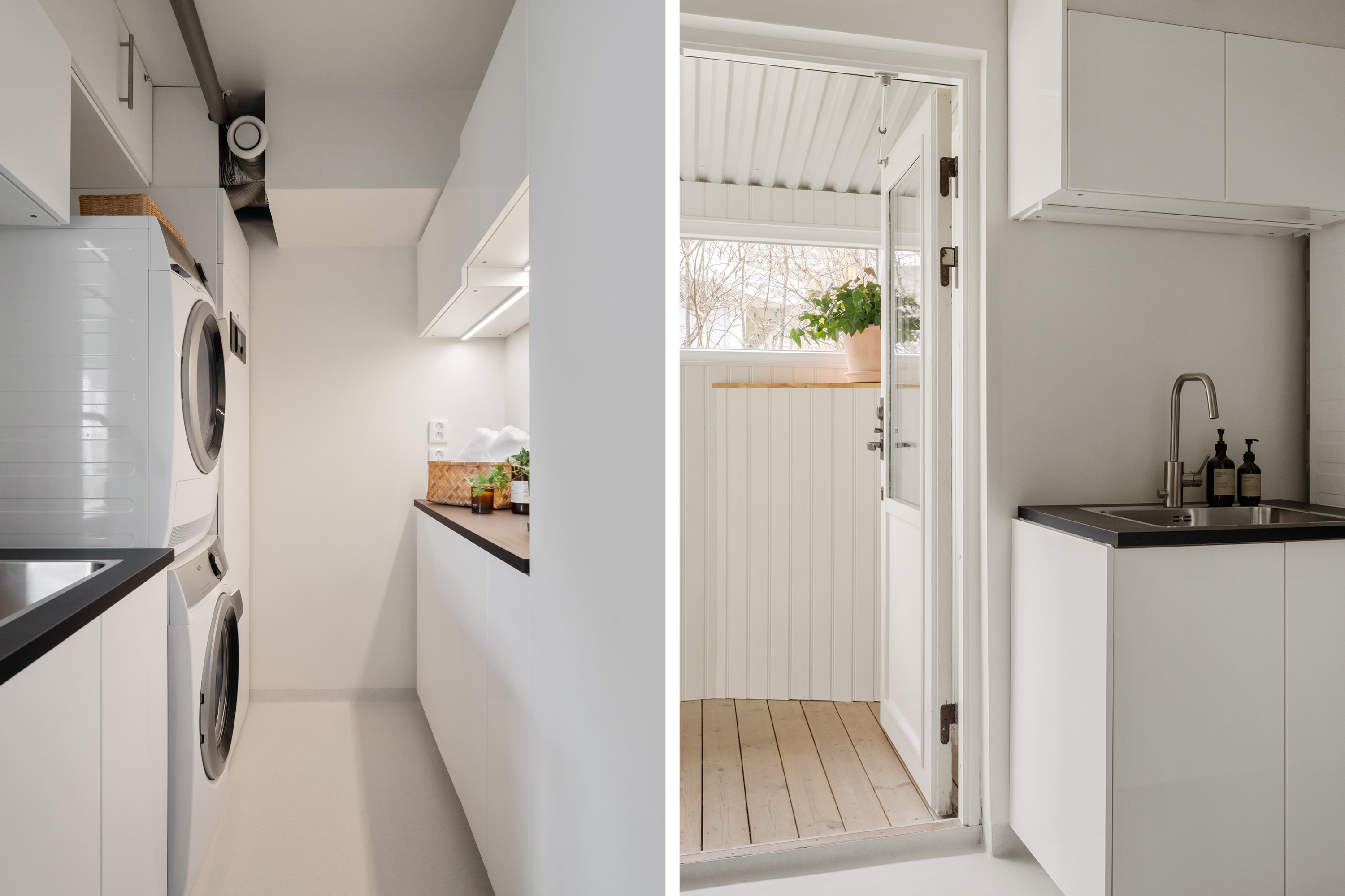 Tvättstugan är funktionellt planerad med generösa arbetsytor och gott om förvaringsmöjligheter. Härifrån finns även en praktisk utgång till antanen, vilket gör rummet till en utmärkt groventré.