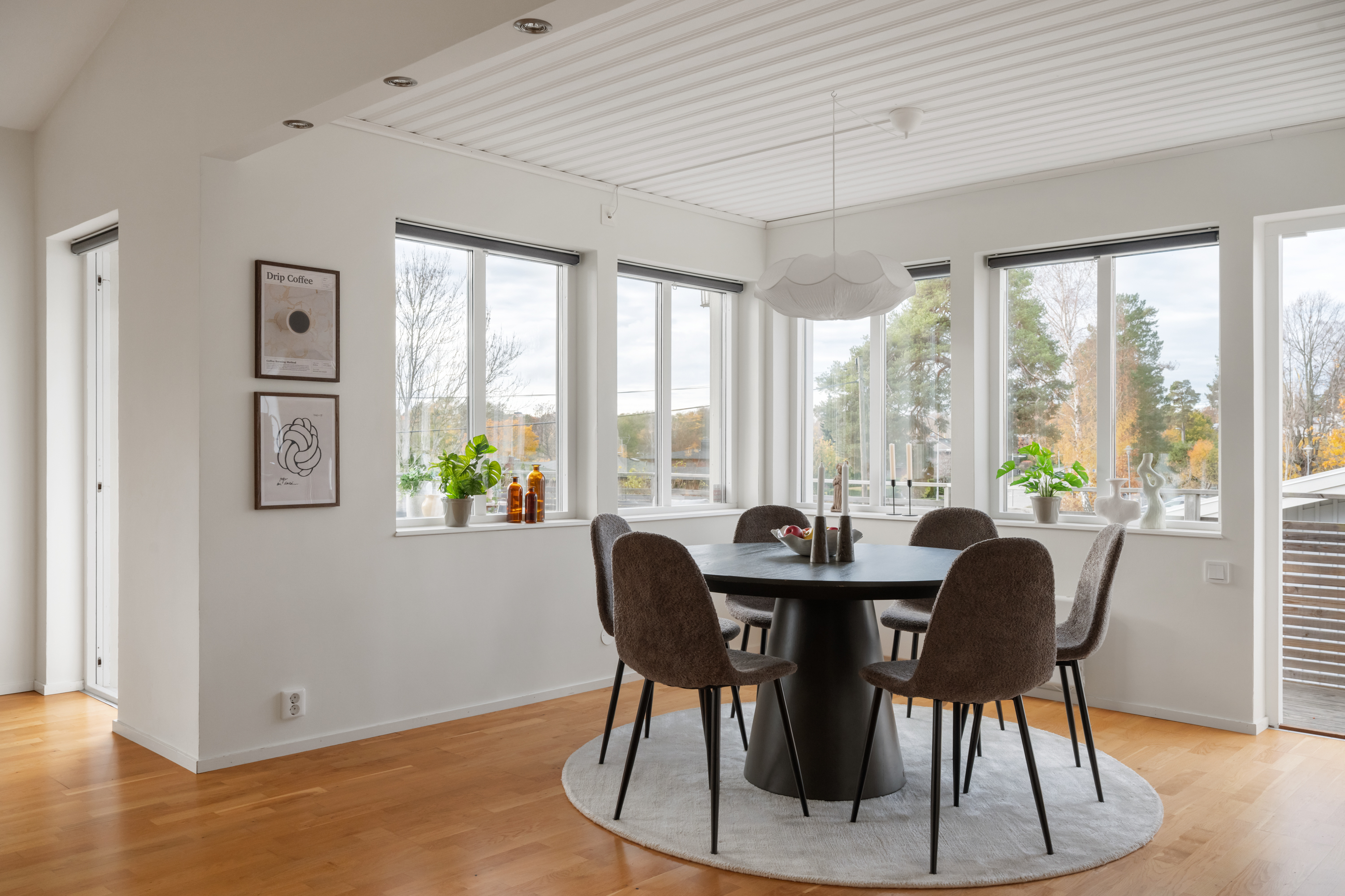 Matplats med utgång till terrass rymmer ett stort matbord och är beläget i öppen planlösning mot vardagsrum.