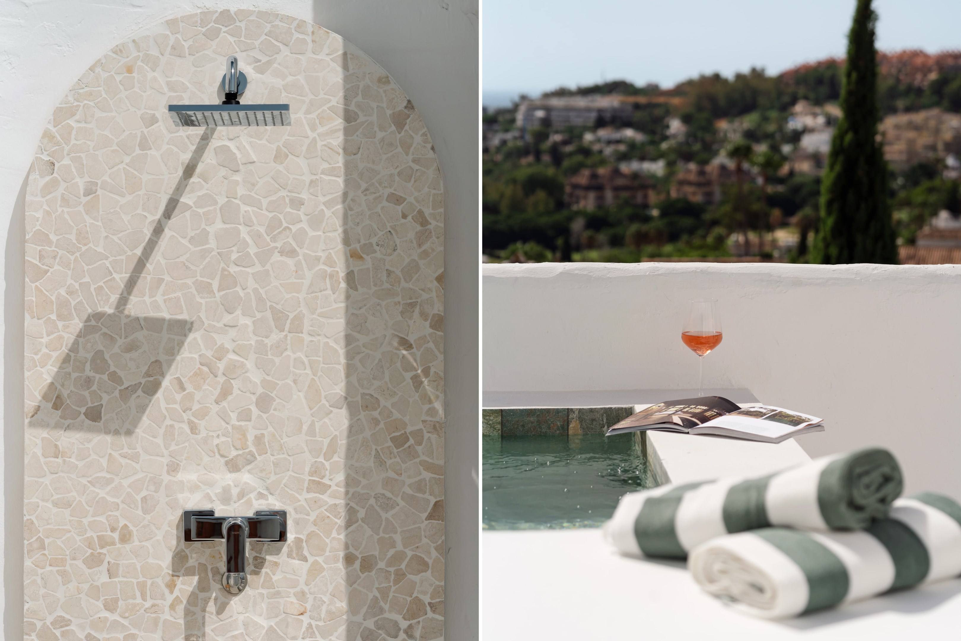 Fullständigt renoverad och med en självklar stilkänsla kombinerar denna takvåning i hörnläge med 3 sovrum och 3 badrum elegant skandinavisk design med vidsträckta Medelhavsutsikter. Bostaden är fördelad över två plan och badar i ljus - perfekt för ett avslappnat liv vid kusten. På entréplanet möts du av en öppen planlösning mellan kök, matplats och vardagsrum som leder direkt ut till en generös sydvänd terrass - perfekt för långsamma morgnar eller middagar under stjärnorna. Köket är utrustat med eleganta italienska marmorbänkskivor och en inbyggd vinbar, medan ett gästsovrum med eget badrum och egen terrass erbjuder både integritet och komfort. En trappa upp finns ytterligare två sovrum med egna badrum och terrasser. Mastersviten har en walk-in closet och en rymlig terrass med privat plunge pool, utedusch och fri havsutsikt - en sann oas. Bostaden ligger i ett säkert, inhägnat område med vackert anlagda trädgårdar och gemensam pool. Två privata parkeringsplatser ingår. Allt detta bara en kort promenad från förstklassiga golfbanor och restauranger.